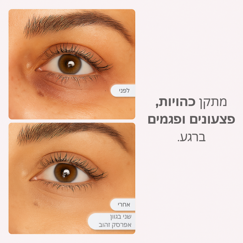 הנוסחה החכמה לא רק מבהירה את אזור העיניים, אלא גם מנטרלת אדמומיות, פצעונים וכתמים בכל הפנים. למראה עור אחיד, טבעי וזוהר בשניות.